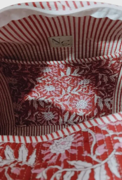 Travel in style with this vibrant quilted duffle bag, designed to be both practical and chic. Featuring a bold red base with delicate white floral detailing, this bag adds a touch of elegance to your everyday adventures. Lightweight yet spacious, it’s perfect for weekend getaways, gym sessions, or daily errands. The sturdy double handles and durable quilted fabric make it as reliable as it is eye-catching.