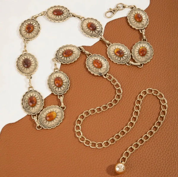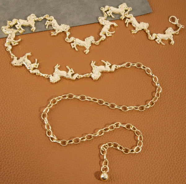 This chain belt features a fashionable multi horse and Amber colored western style. Celebrate the art of accessorizing with this piece that effortlessly encapsulates modern trends.