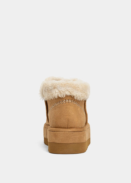 The cozy bootie you’ll live in all season. ULLA in Camel Suede combines rustic charm with a modern silhouette thanks to its contrast stitching, plush faux shearling lining, and chunky platform sole. Whether you're running errands or curling up with a good book, this slip-on boot delivers comfort, style, and a little winter magic.