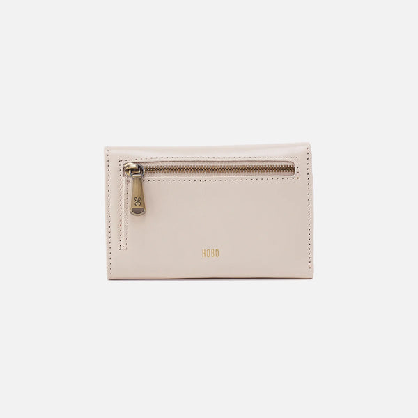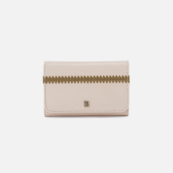 A trifold wallet with a magnet closure.