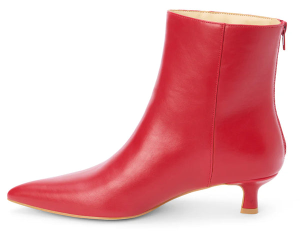 Vegan faux leather ankle boot with a pointed-toe and kitten heel.