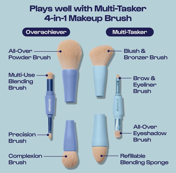 This 4-in-1 makeup brush packs all your must-have full face brushes in one: All Over Power Brush, Multi-Use Small Blending Brush, Precision Brush (eyes, lips, highlighter), and Complexion Brush (foundation, blush, bronzer).