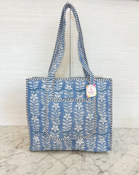 Carry a touch of autumn charm with this floral tote bag. With its classic blooms in a variety of blues, this bag is the perfect companion for crisp fall days. Roomy enough for your farmer’s market finds, a cozy scarf or your everyday essentials, it’s as practical as it is stylish. The striped handles and trim add a playful twist, making it an easy grab-and-go piece for all your autumn outings.