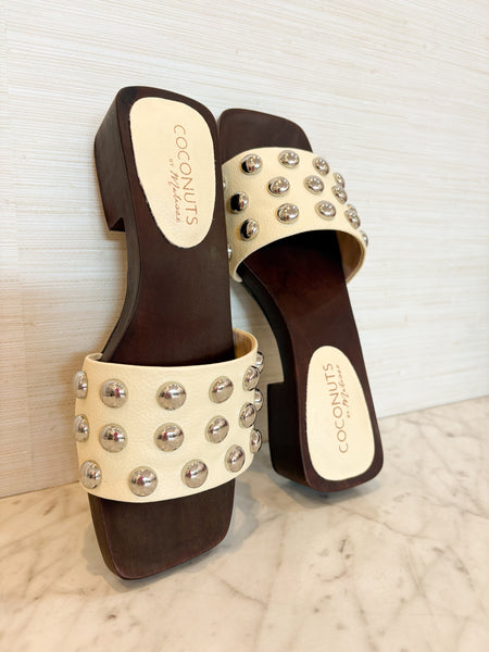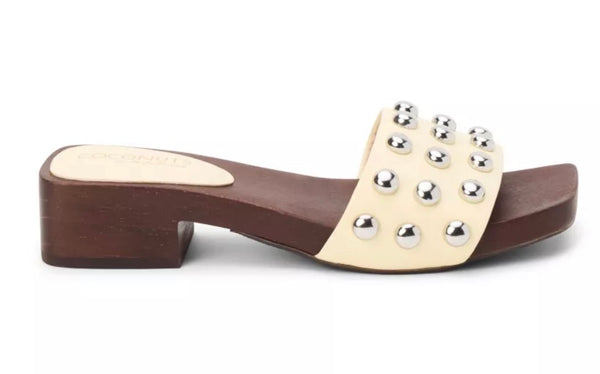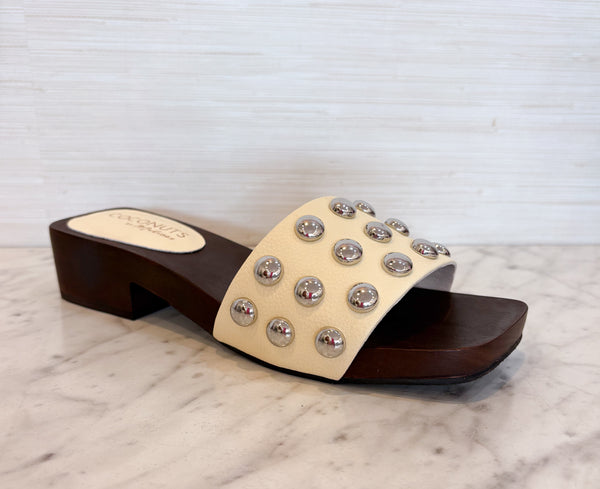 Vegan one band slide sandal with silver stud detailing.