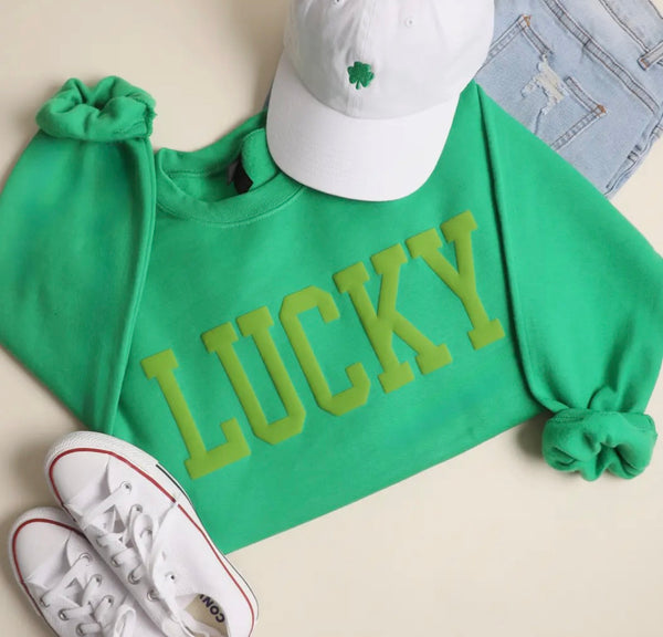 Cozy up, and show your St. Pattys Day spirit with the Lucky Puff Sweatshirt! Warm, cute, and GREEN!! What more could you need?