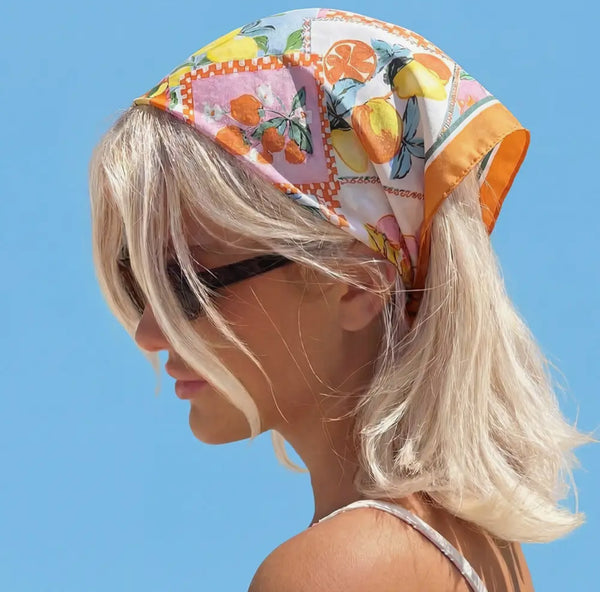 This bandana features a fashionable assorted fruits print. Witness the perfect fusion of style and functionality as this bandana effortlessly complements your lifestyle.