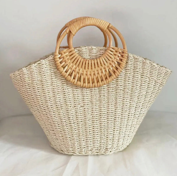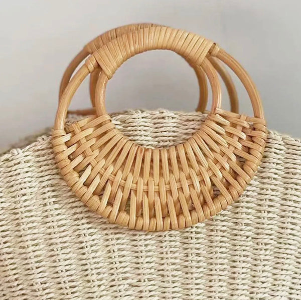 This stylish bag is perfect for everyday use. It has a beautiful weave, natural color, and a chic handle.