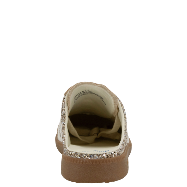 The Back 70 glitter mule brings sparkle to everyday style with a distinctly feminine, boho edge. Designed in shimmering gold glitter, this effortless sneaker mule blends laid-back charm with the brand’s signature vintage detailing. The open-back silhouette adds ease and personality, while subtle suede trims and retro accents keep it unmistakably Back 70. A perfect mix of glamour and casual cool, it’s made for the girlie girl who loves her sneakers with a little shine.