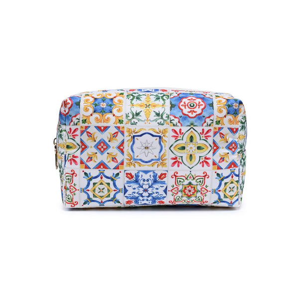 Mediterranean-stamp motif makeup pouch. Amalfi Escape Cosmetic Pouch. Roomy rectangular silhouette, zip-top closure with gold-tone pull, roomy interior that keeps brushes, palettes and essentials organized. Lightweight, vegan-friendly textile, wipeable surface for easy care. Playful tile motifs — sun, seahorse, crab, citrus — deliver a resort-ready, fashion-forward feel that pairs with work-to-weekend wardrobes. Ideal for travel, gym, or daily handbag rotation. Stylish, practical, ethically minded.
