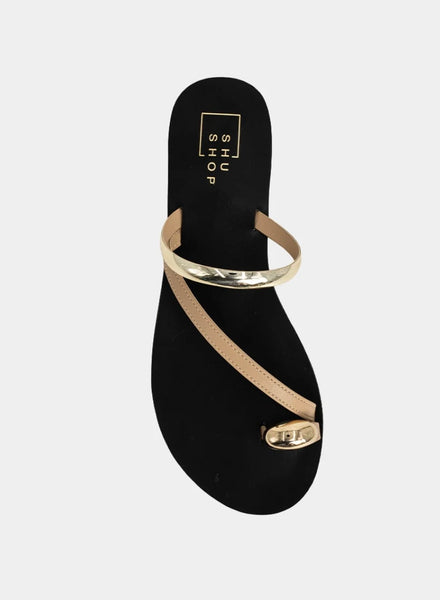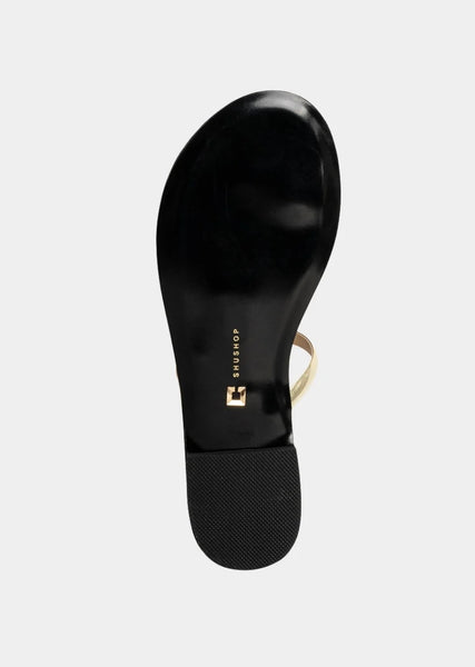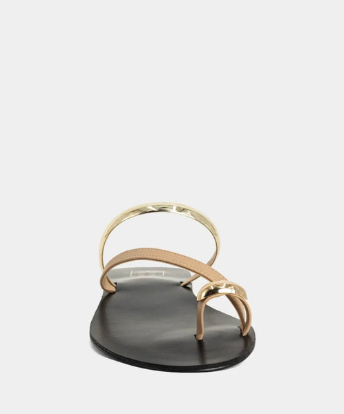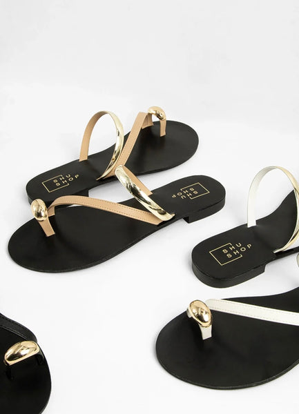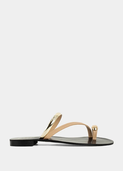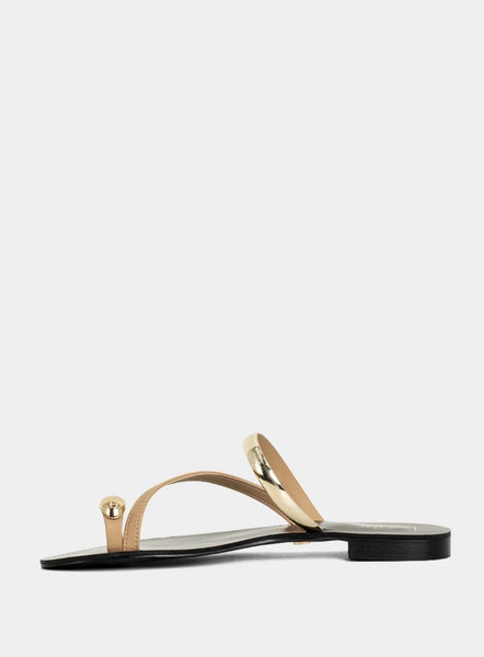Polished yet barely there, BRENDA NUDE is your new go-to sandal for effortless elegance. Designed with minimal nude-tone straps and striking gold accents, this sleek flat combines comfort with high-shine detail. Whether you're city strolling or heading to brunch, it’s the ultimate warm-weather essential.