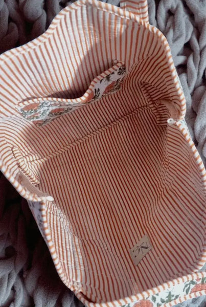 Carry a little Sunshine everywhere you go with this charming quilted tote.  Featuring a hand-block inspired floral print in warm terracotta hues, this bag blends timeless style with everyday function.  The lightweight quilted cotton design makes it perfect for errands, farmers’ markets, work, or weekend adventures.  Comfortable striped handles add a playful touch while the spacious interior ensures you can fit everything you need with ease.  Whether you’re tossing in your laptop, favorite book, or fresh blooms, this tote is as versatile as it is beautiful.