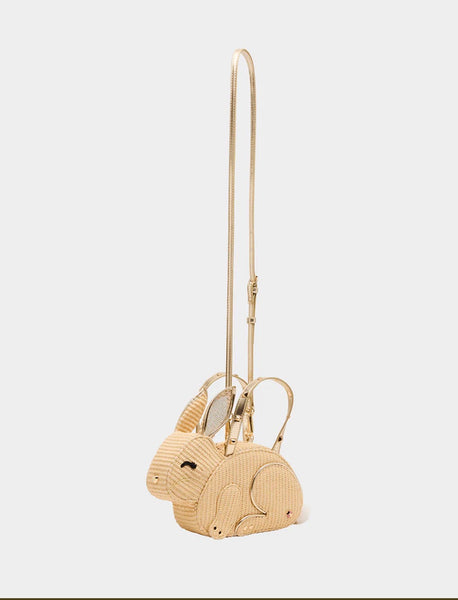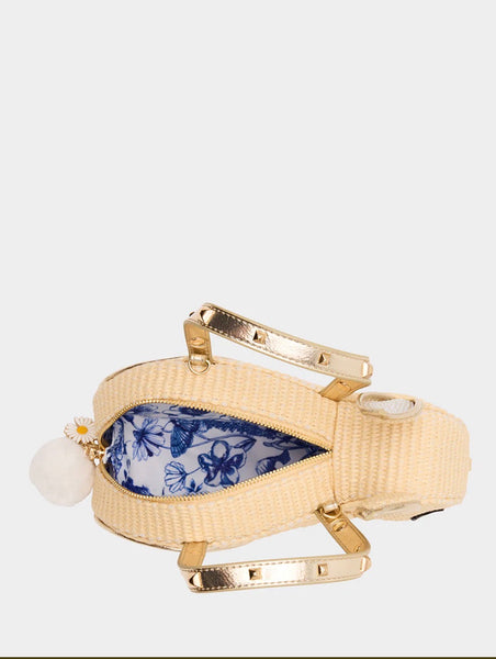 Hop into spring with our HIP HOP HANDBAG. This adorable bunny shaped handbag is equal parts whimsical and functional. Featuring a fluffy pom pom tail, sparkling rhinestone studded ears, and gold stud handles, this Easter essential transitions effortlessly.