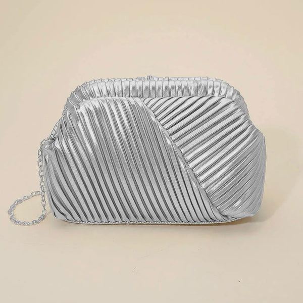 This refined evening clutch showcases a sculpted, pleated exterior with a soft, structured silhouette that adds dimension and elegance. A detachable chain strap offers styling versatility, making it an ideal accessory for special events, nights out, or polished everyday looks.