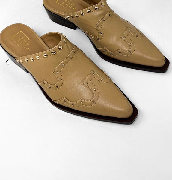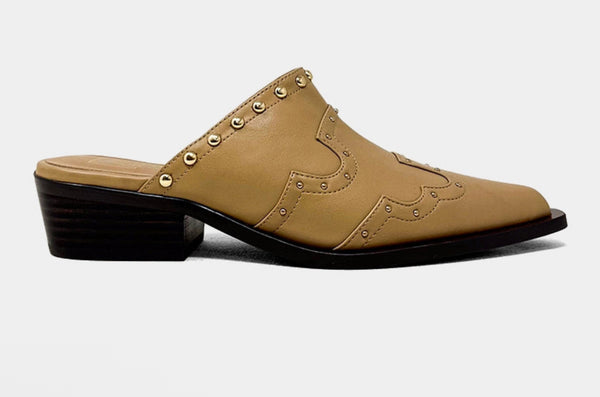 Western charm, modern twist. THALIA in Nude brings a laid-back, statement-worthy vibe to your wardrobe. This mule features tonal western stitching, antique gold studs, and a sleek pointed toe-perfect for when you want to feel a little country, a lot chic.