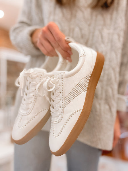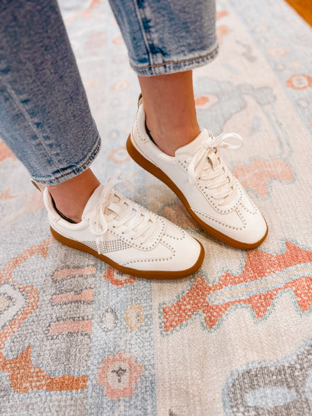 Cute, functional, and comfortable. These sneakers check all the boxes. Step out in style with the Women's Wylder Low Top Sneaker by Matisse in fresh white. Crafted from vegan faux leather with a round toe and flat heel, these sneakers feature silver studs and a comfortable 1 inch heel. They offer a manmade outsole, textile lining, and a padded insole for all-day wear. Designed with a lace-up closure, these sneakers are perfect for adding a touch of streetwear flair to your wardrobe
